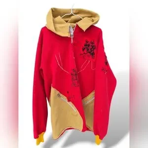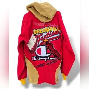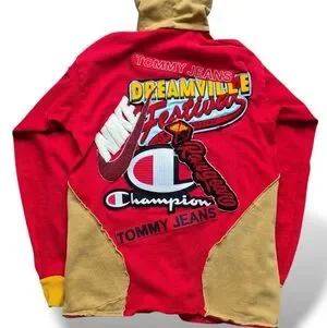 Thick & heavyweight cotton rugby jersey hoodie. A red & dark yellow hoodie in the style of a traditional rugby jersey featuring two large angled pockets secured with chrome zips, printed patches, 'YAMS' embroidery accross the chest, a vintage style chrome zip at the collar, and an array of large patches, both chenille & embroidered varieties, from vvariousbrand including Nike, Champion, Tommy Hilfiger, Rawgear and the largest of the bunch, Dreamville Festival, a multi-day concert hosted by the music label of the rapper J. Cole.