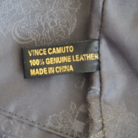 Black pebbled leather with gold hardware including zippers, studs and Vince Camuto gold tag