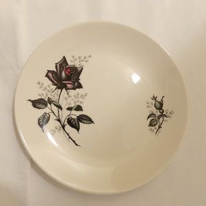 7" in diameter. Elegant black rose print 🌹 Gold stamped. In very good condition, with no chips, and a few blemishes on the underside.