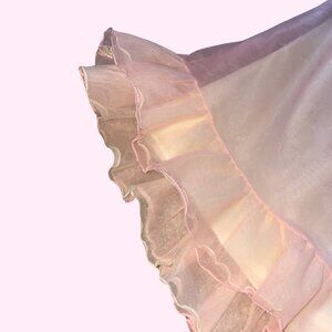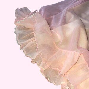 PICTURES DON'T DO HER JUSTICE!!! I've been hunting for years and years and I've NEVER seen a fabric quite like this in person. Pink, buttercream yellow, sunset orange, coral...beautiful and RARE, this colour-shifting piece transports us back to the glamorous 60s. The perfect vanity room piece -- I see it draped over a changing divider screen. Under-slip is a buttercream yellow, while the sheer over-lay beholds the sunset-inspired colour-changing magick. You must see her magick in person!!!