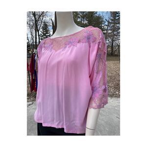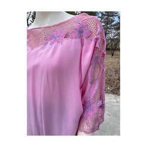 SOLD Vintage | 80s Dolman Sleeve Top Pink Purple Floral Lace 3/4 Sleeve L/XL