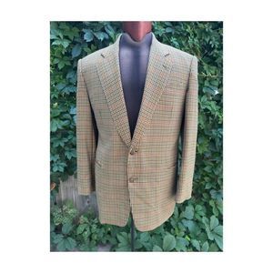 No size noted, only measurements in cm. 100% Cashmere sport coat/blazer made in Italy. Houndstooth pattern in blue, red and green over a tan base. Fully lined, striped pattern inner sleeve lining. Shoulders are padded. No rips tears or stains. Rounded buttons leather with a cross-hatch pattern.