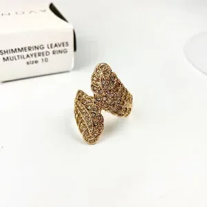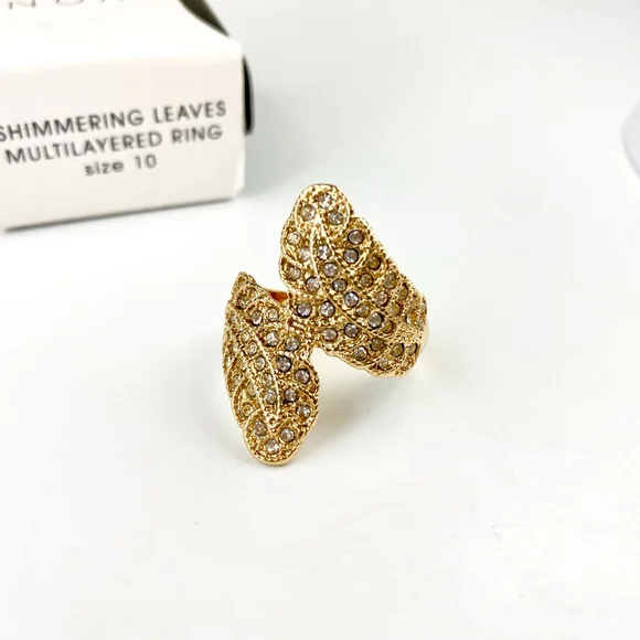 This Avon ring features a gold-tone finish with a "shimmering leaves" multilayered design, as indicated on its original packaging. The ring is adorned with numerous clear, small, round rhinestones covering the leaf-shaped elements. It is a size 10, visible on the box. The ring has a bypass style, with two leaf-like structures meeting on top. The underside of the ring is smooth and polished gold-tone. No significant imperfections are visible and in new unworn condition.