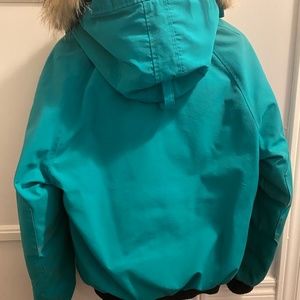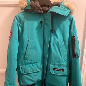 Selling teal women's authentic Canada Goose bomber in a size medium (although it could fit a size small). The colour is pretty accurate to the pictures. Good condition, the only noticeable flaw is a pulled thread on one of the sleeve cuffs (as pictured). If you have any questions feel free to reach out!