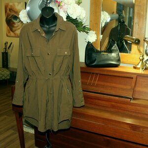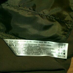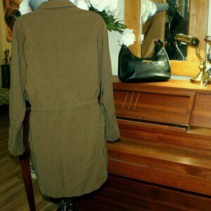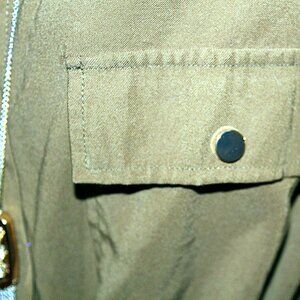 This Zara shirt is all about versatility, practicality and looking good at the sametime. There are four working pockets to carry anything you want with its quality weight fabric and construction there is no worries of weak pockets. This top has adjustable sleeves from 3/4 to full changing the feel of the top or getting the sleeves out of the way for tasks you need to achieve. An adjustable drawstring changes the silhouette of the shirt from loose to fitted depending on what you want, what you are pairing it with and how you feel that day. The silver snap buttons allows you to easily get into this piece in a snap The collar completes the neckline and can worn completely closed or relaxed It truly is up to your choice. Details have not been forgotten the draw string has a finished metal edges in a light gold. Completed in a khaki green this neutral works well with several colours and many types of outfits. SOLD