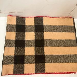 Authentic BURBERRY Cashmere Reversible Giant Check Block Fringe Scarf in Camel Check and Red on the reverse side.
