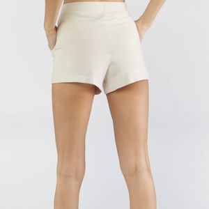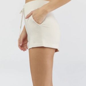 This short features an elasticized waistband with drawstrings and brushed knit material.