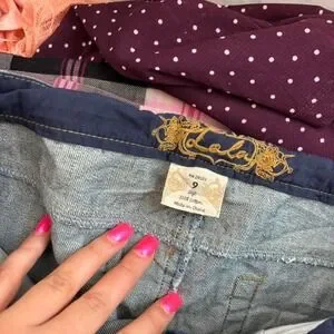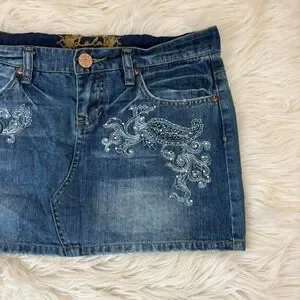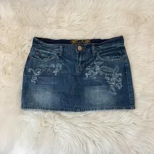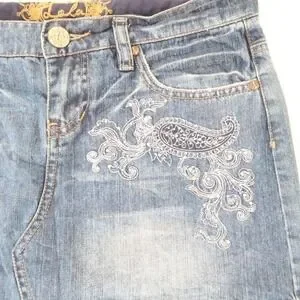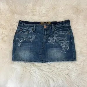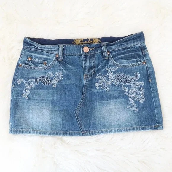 Lola Jeans Y2K Low Rise Denim Mini Skirt with Rhinestone Paisley – Size 9