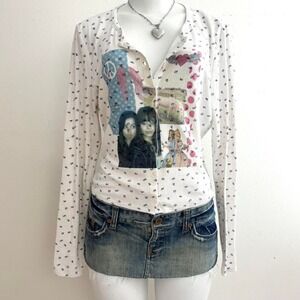 The ultimate Y2K statement mini. This Lola Jeans denim skirt features a classic low-rise fit with intricate silver rhinestone paisley detailing on both front hips. Medium wash denim with a raw hem for that true early-2000s McBling look.