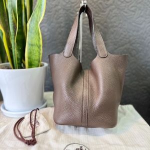 A classic beauty that will elevate your style effortlessly. With its clean edges and unlined design, this supple bucket bag exudes timeless elegance. Crafted to perfection, it is the perfect companion for any occasion. Known for its simplicity and sophistication, the Picotin 18 Bag is truly exceptional piece and such a steal for this price!