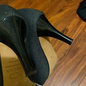 In perfect condition Oscar dela Renta Pumps, in leather and fabric material. Heels are about 2 inches high. original box no longer available but will ship in a box.