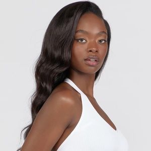 This top features a V-neck halter neckline, ribbed knit material and a seamless construction.