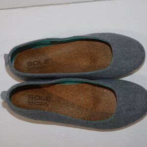 This Pair of Womens 10 Gray SOLE District by ReCork Grace Carbon Negative Gray Round Toe Slip on Flat Shoes are in great clean condition - some light discoloration to inside sole from basic wear - outer is in excellent condition. Inside Sole in make of cork - Light grey wool upper molded sole ballet flat shoe