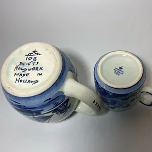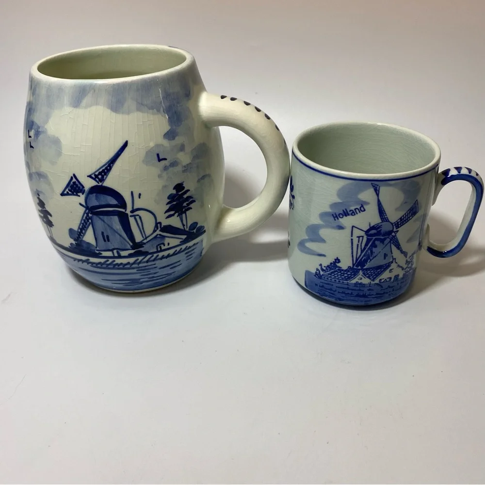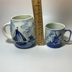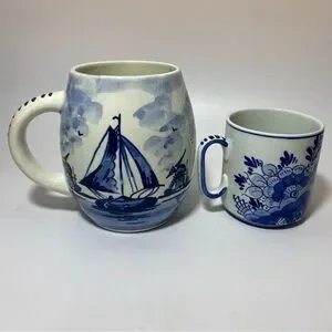 Set of two mugs with windmill design. Features blue and white colors.