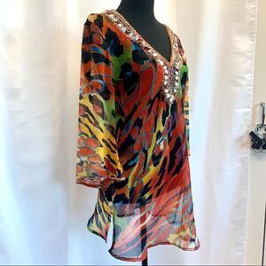 Beautiful multicoloured sheer chiffon blouse with a sequin V-neck line. Beaded trim along the cuffs on the hands as pictured. Can be worn as a beach cover-up or a blouse