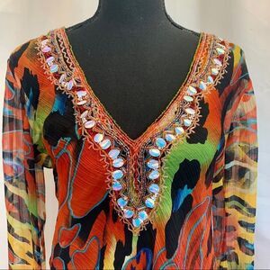 SOLITAIRE BY RAVI KHOSLA multicoloured sequin beaded beach cover-up blouse M🔥