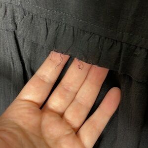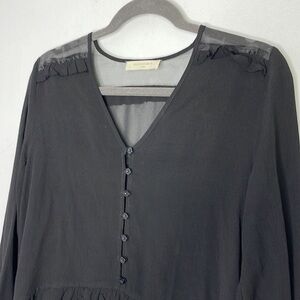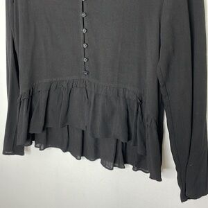 In good second hand condition gently worn. 100% rayon. Ruffle details on the shoulder and the bottom. Sheer panels on top. True half front buttons. Minor fraying on the seams of the ruffle and a tiny hole near the inside brand tag. Measure lay flat: shoulder 16,5'' bust 17,5'' front length 21'' back length 25,5'' sleeve length 25''.