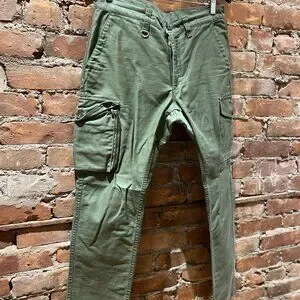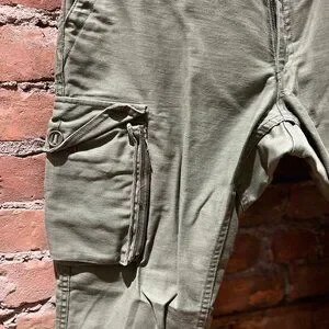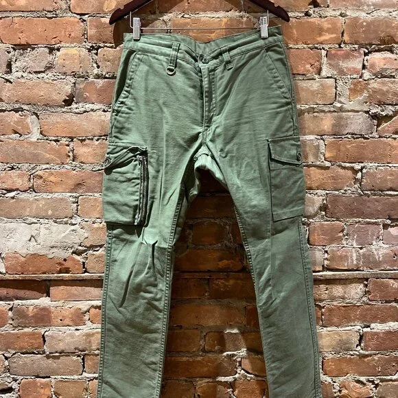 Signature pair of utility trousers from SOPHNET., crafted in Japan from a durable 100% cotton twill in a washed olive finish. This style features the brand’s functional, military-inspired detailing: dual side cargo pockets (one with zipper entry), flap back pockets, reinforced circular seat panel, and subtle darting for shape. Silver-tone hardware, a D-ring at the belt line, and clean straight-tapered legs complete the design.