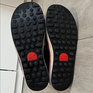 SOREL Glacy Explorer Gray Suede Winter Boots Black contrast Orange Laces, Size 8 with wider foot bed.