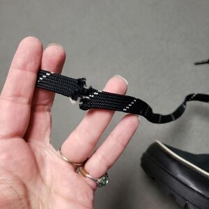 Some minor scuffs on suede as pictured. One lace is cut as pictured. Minor wear on back heel as pictured.