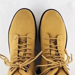 New with tags, SOREL women's Hi-Line waterproof and ultra lightweight lace up boots in a mustard Geo yellow leather suede, size 8.