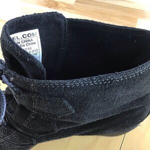 These boots have been gently worn. These are great for the mid season. Black suede heeled ankle boots that can be worn everyday! There is a piece that keeps the laces in place that is getting loose. It still works but it may have to be repaired in the futur.