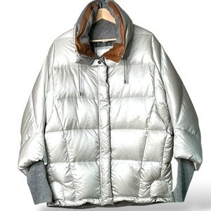 This beautiful puffer is in exceptional condition and show no signs of wear. I do not believe it has ever been worn. Size says 2 but it may be coded sizing. I am an XL and it fits me beautifully. I have listed as Large to be on the safe side but be sure to check measurements in the photos. If you need more info, please don’t hesitate to ask. I generally respond to questions quickly. Wool sleeve inserts with thumbholes and hidden hood in the collar. The brown trim on the jacket is genuine leather per my research. Fill is down and feathers. Full zip and snap closure. Photos are important so please check all for condition, detail and measurements.