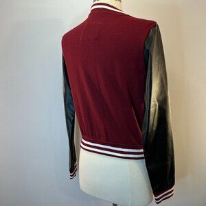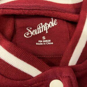 SOUTH POLE Women's Burgundy Button Front Wings Jacket - Size Small - NWT $50. 60% cotton, 40% polyester, made in China. Sleeves are polyurethane. Two front pockets. Wings Southpole logo on front.