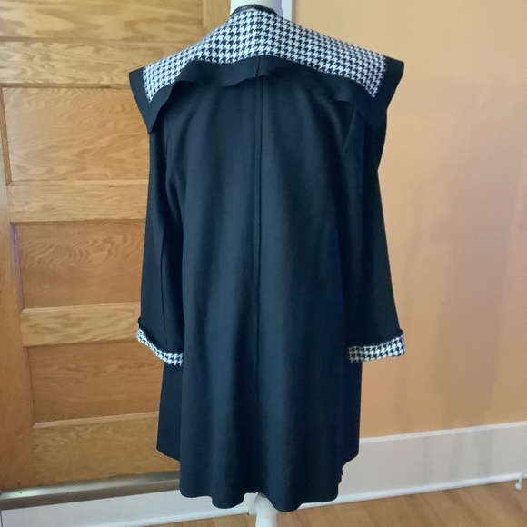 Stylish and versatile open-front duster cardigan by Spanner. Features a bold and sophisticated houndstooth pattern on the trim. An oversize collar, turn back cuffs and exposed houndstooth lining add drama.