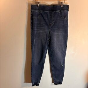 SPANX Sz M Pull On Jeans Skinny Distressed Mid-Wash Raw Hem High Raise Denim NEW