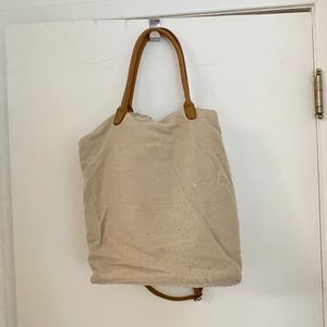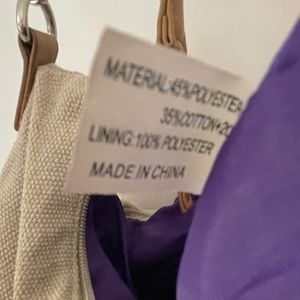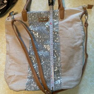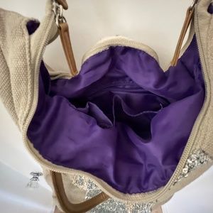 Light tan with silver sequin panel down the front of the bag. Long cross over body strap and shorter shoulder strap, see measurements. Interior is lined with a vibrant purple. There are 3 pockets inside, one with a zipper.