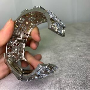 Excellent condition and very sparkly. Perfect addition to your evening outfit. I just wore this as a bracelet because it was so beautiful. Got so many compliments on it. The watch opens by a spring