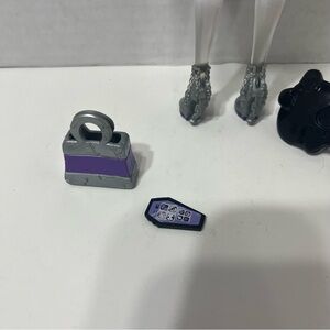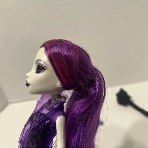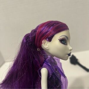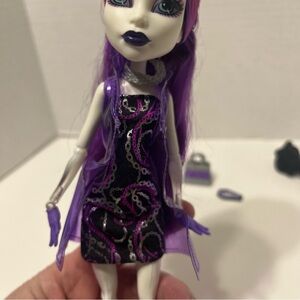 Monster high doll spectra ghouls night out doll. Comes with everything shown. The edge of her hairline on her face seems like it has yellowed slightly. Otherwise excellent condition. Comes with everything shown. Smoke free home. See my other listings for more monster high dolls.