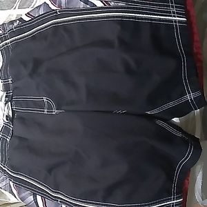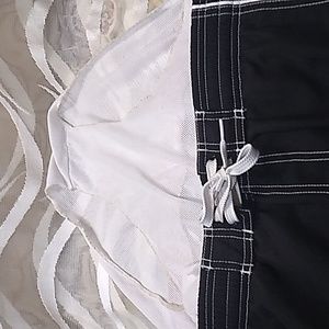 Great shape, really nice looking shorts, has swim mesh lining, black with white red and grey and "Speedo" embroidered on left thigh of shorts no size tag but these measure 19 inches across at waist and 21 inches top to bottom, go b measurements but my guess is these are a large or x large. Really nice soft/light material.