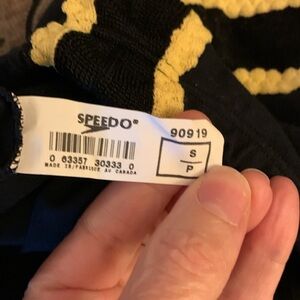 Chic Speedo swim set in black with gold trim. Ideal for beach or pool days.