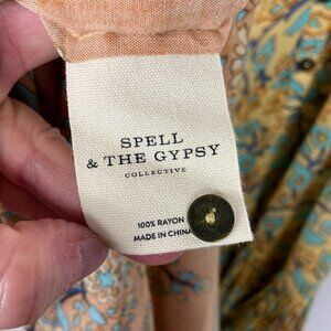Spell and The Gypsy Collective The Delirium Maxi Dress in Gold and Women's Size XXS. Fits true to size. A draping and exceptionally flowing maxi in a striking border gypsy print, this dress is a charming and romantic piece that will easily take you from day to night. The print features classic motifs of water vines and elephants and the flourishing combination of tan, gold and pale sage hues makes it the statement piece of the season. This maxi boasts a flowing skirt that tumbles down to the ankle in tiers with a deep, statement border at the hem. With a fresh t-back style and button up front it's super versatile for different occasions – button it for a high-neck fashion forward look, or unbuttoned for date night or casual feel. Pairs with tan slides and some gold accessories. 100% rayon. Hand wash. Very good pre-loved condition. No visible flaws.