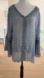 Spense popover top has bell sleeves and a v neck with a handkerchief hem, sides longer than front and back. There is lace see through trim on the sleeves and it is also stitched around the neck and down the front (not see through). The top itself is on the sheer side. Oversize fit. It is a mid blue with an overdyed effect. 65% rayon/35% polyester.