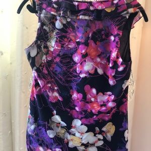 Beautiful lined floral blouse with accenting ruffle along the front bodice. Nice a-line shape to it. Looks awesome with black or white jeans.