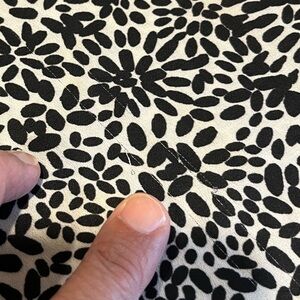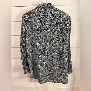 Light and fluid button-down blouse with a black and white micro leaf pattern. Soft pleats on the shoulders and sleeves give it a lovely drape. Lightweight stretch fabric with tiny mesh-like texture (see close-up photo). Classic collar, full button front, slightly longer in the back. A beautiful and easy piece for layering or on its own.