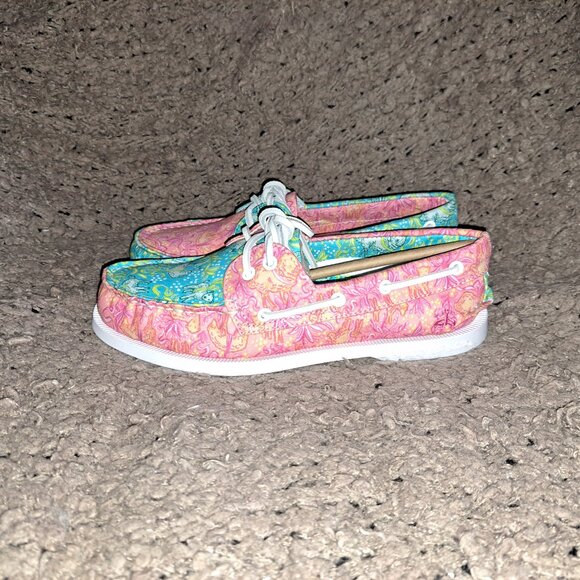 The colorful design, with accents like a bow and logo details, adds a fun and unique touch to the classic boat shoe style.