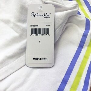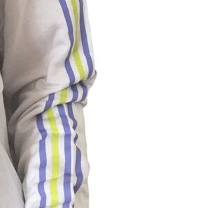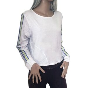 Features: Authentic Splendid, Long sleeve, Vented cross-over back, oversized for comfort, cropped silhouette, finished cuffs, made with high end rayon fabric, sharp sporty stripes down sleeves, super soft textile, pull on, rounded neck