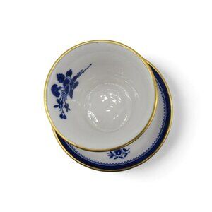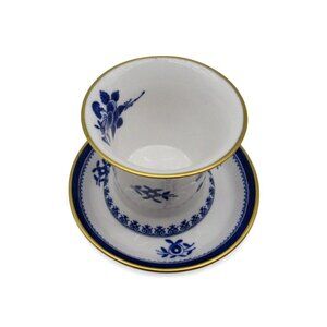 Adorned with a delicate blue floral pattern against a pristine white background, it features luxurious gold trim for a touch of opulence.