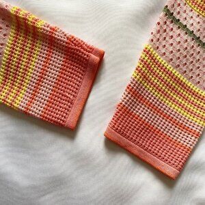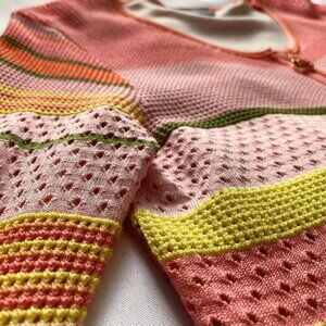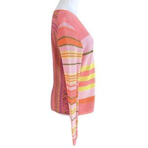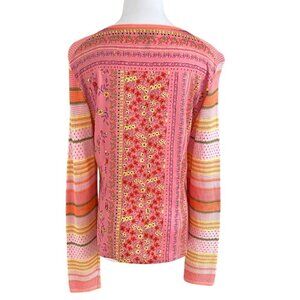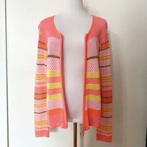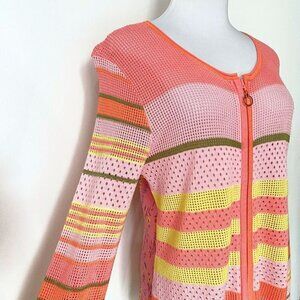 SPORTALM KITZBUHEL DAVINA COLORFUL OPEN KNIT AND SATIN FLORAL PANEL ZIP UP JACKET, This is a lightweight open knit zip-up jacket in vibrant pastel colors and satin floral back panel - collarless - full length zip with a gold metal zip hanger - unlined - stretchy - slim but great fit comfortable - casual mixed long sleeves - scoop neckline - Perfect for spring - Easter vibe - mix of preppy-recreational styles - wear alone with a fitted camisole or layered with jeans.