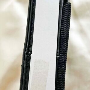 DETAILS: 7 ¼ in. L elastic inside on one side, 1 in. ribbon and velcro strap inside on other side. Also 1 in. ribbon pull tab sticks out the top for easy opening. NOTE: White band around the edge is a paper protector.