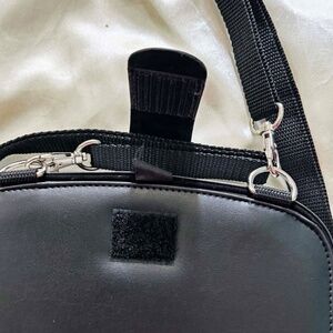 SQUARE BAG CONVERTS TO A BACKPACK, BLACK FABRIC, LINED, TWO STRAPS, FLAP CLOSURE WITH VELCRO, TAGS ON NEW NEVER USED, NO DAMAGE