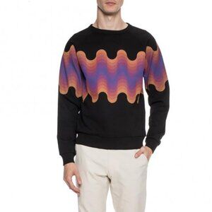 Black sweatshirt from Dries Van Noten x Verner Panton. Made of cotton. Decorated with an orange and purple print. Ribbed round neck, bottom hem and cuffs.