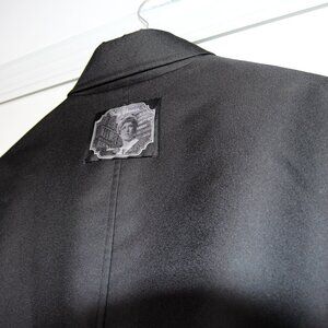 Features an absolutely amazing print all over the front side of the coat. It's a work of art that is to be worn, a stunning piece.