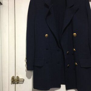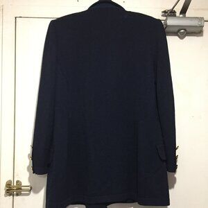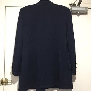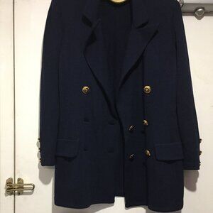 St John Double Breast Sweater Jacket, Size 10, Color Blue, Knitted Wool, Shoulder Pad, Front Flaps, Closure Buttons, Front Small Hole, Pocket Flap Lining Thread Pulling but in Good Condition, Made in USA, Sweater Tall Jacket, Great Look, Great Fit.