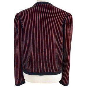 ST JOHN BY MARIE GRAY BLACK RED STRIPED CHENILLE KNIT CARDIGAN, this is a super soft and thic chenille knit cardigan in a black and red striped pattern with a patch chest pockets - hook & eye closure at neckline only - round neckline - long sleeves with nothing at cuffs - slightly short in length yet not cropped. Perfect classic, mature business to business casual layer for fall and winter condition over a black sheath dress, pencil skirt or just a black dress pants and loafers.