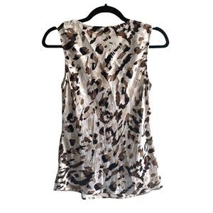 ST JOHN Sleeveless Silk Draped Printed Blouse Tank Top White Tan Brown Black Size XS/S (says P on tag. Please go by measurements) Approximate Measurements Pit to Pit 18” Length 24” EUC one thread pull upper back. Not noticeable. See photos. Madewell, Anthropologie, Free People, J. Crew, Aritzia, zara, banana republic, BCBGMaxAzria, office, work, business, casual, summer, date, classy, elegant, feminine, MaxMara